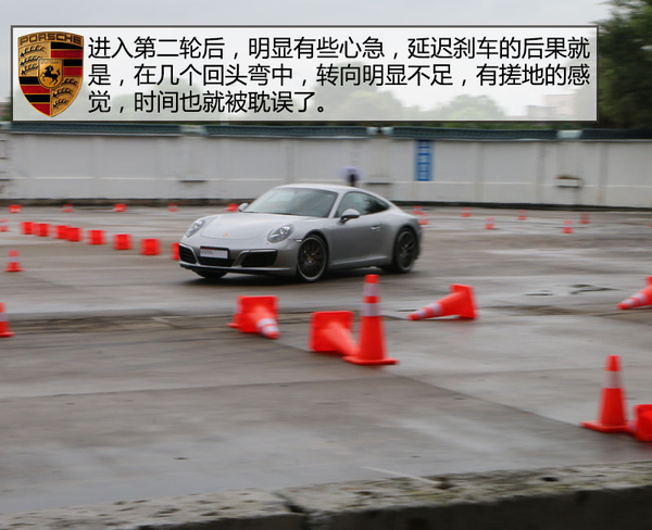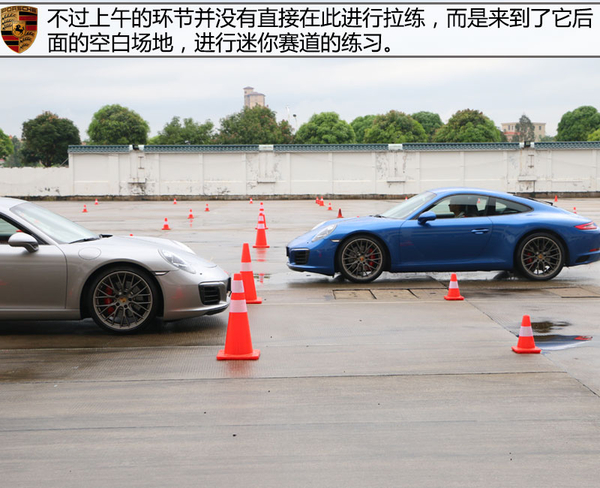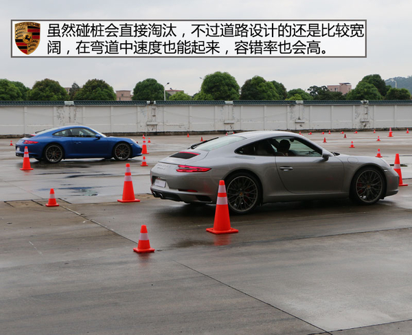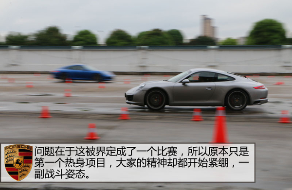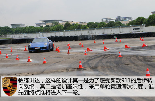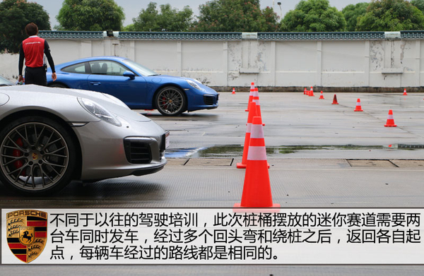 不同于以往的驾驶培训,此次桩桶摆放的迷你赛道需要两台车同时发车,经过多个回头弯和绕桩之后,返回各自起点,所经过的路线都是相同的。教练讲述,这样的设计其一是为了感受新款911的后桥转向系统,其二是增加趣味性,采用单轮竞速淘汰制度,谁先到终点谁可进入下一轮,当然如果碰到桩桶,则直接淘汰。