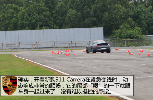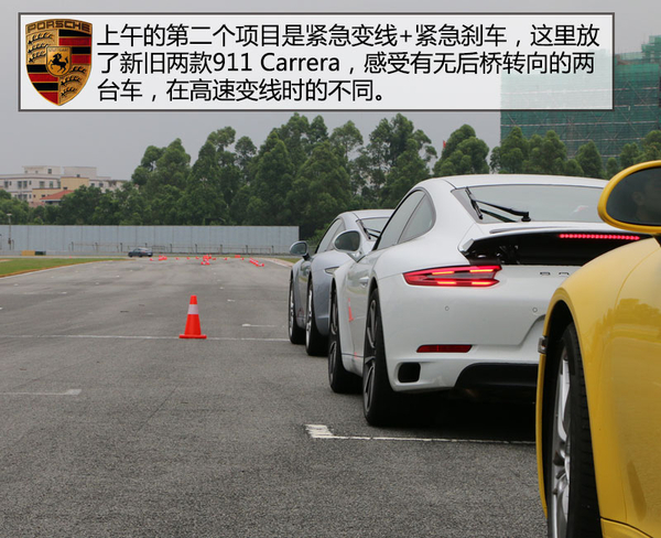 上午的第二个项目是紧急变线+紧急刹车,这里放了新旧两款911 Carrera,感受有无后桥转向的两台车,在高速变线时的不同,尤其尾部的晃动差异非常明显。当然除此之外,涡轮和自吸的碰撞也更为直接。