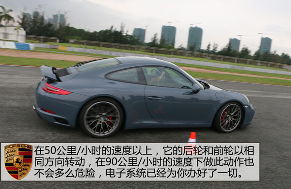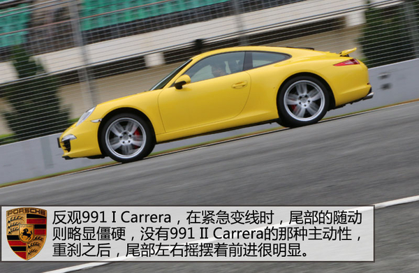 确实,开着新款911 Carrera在紧急变线时,尾部非常的灵动,在50公里/小时的速度以上,它的后轮和前轮以相同方向转动,“嗖”的一下就跟车身一起过来了,你感觉不出难以操控,在90公里/小时的速度下做此动作也不会多么危险,电子系统已经为你办好了一切。反观991 I Carrera,在紧急变线时,尾部的随动则略显僵硬,没有991 II Carrera的那种主动性,而是被动的被车身拖拽过来,到达一定速度临近点后的重刹,尾部会有很明显的左右摇摆,并伴随着前进,而新款则相对好很多。