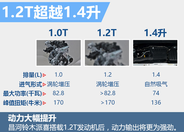 昌河铃木现款派喜搭载1.4升自然吸气发动机,该发动机最大功率74千瓦,峰值扭矩136牛米。网通社从铃木汽车官方了解到:铃木将于年内投产1.0T和1.2T增压发动机。昌河铃木是铃木汽车在华合资企业,未来将引进铃木最新的发动机技术来实现产品的动力升级。目前铃木1.2T动力参数尚未公布,根据1.0T增压发动机动力超越1.6升发动机,1.2T的动力输出无疑也将会超过1.6升发动机,未来派喜有望搭载1.2T涡轮增压发动机,实现动力的大幅提升。