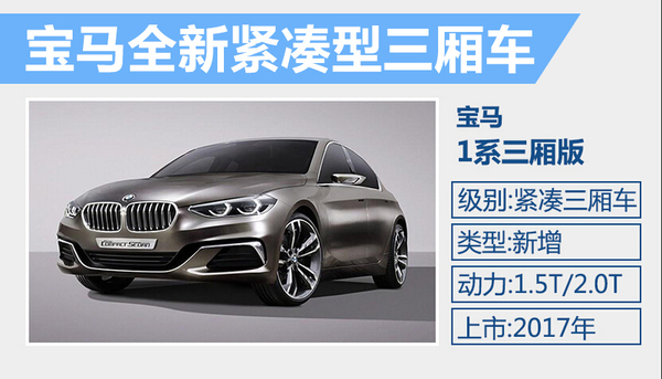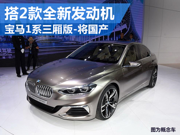 随着宝马在华本土化战略的不断推进,国产车型的产品阵容也在不断扩大,未来将增加至6款。宝马集团董事长科鲁格在5月初来华时表示,全新的紧凑级轿车将很快以国产形式引入。网通社从宝马内部人士获悉:“继创新2系旅行车上市后,宝马全新紧凑型三厢车(外界一直称为1系三厢)也将于明年由华晨宝马进行国产化生产。”照此推算,宝马全新紧凑级轿车将成为宝马在华推出的第5款国产车型,新车将搭载沈阳发动机工厂生产的B系列1.5T和2.0T发动机。