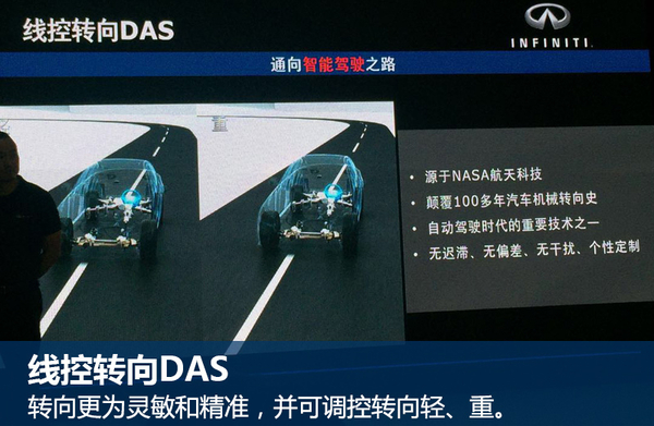 Q50L旗下的运动版和豪华运动版车型配备了英菲尼迪独有DAS线控转向系统。该技术将机械操纵以电子信号方式通过电缆直接传输到舵机,实现电子线控。与传统转向相比,线控转向DAS消除机械转向中力传导的时间差,以无迟滞的电子信号控制带来灵敏的转向特性。