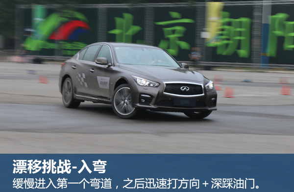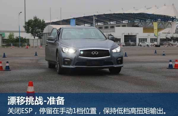 在开始漂移之前需要将Q50L的ESP关闭(保证车辆能够更容易“失控”),再把档位放置手动档的1档位置。因为漂移需要高转速所带来的高扭矩输出,所以漂移开始到结束一直保持1档就可以。在T1弯道时方向盘轻摆超过180度,并深踩油门,感受尾部开始左右摆动,此时车身已经处在漂移过程中。然后迅速将方向盘向右打270度-360度,也就是反打一圈左右,反方向漂移进T2弯道。以此类推,能够在一圈内完成两次漂移则算一人成功,然后换给搭档。