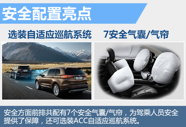 安全配置方面,新款福特锐界2.0T四驱尊锐型拥有高强度吸能式车身,ABS、EBD、ESC和TCS等完备的车身稳定控制系统,为行车安全提供了保障。7个安全气囊/气帘坐车的防护系统,在发生意外时给驾乘人员保护。选装的ACC智能自适应巡航控制系统可自动调节车速并和前车保持设定的距离,在一定程度上可以缓解驾驶员的疲劳程度。