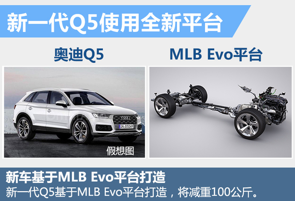 从新一代车型开始,奥迪Q5家族中的全部车型均将采用大众最新的MLB Evo模块化平台打造,得益于新平台的优势,新车车身尺寸上的调整具有很强的灵活性;在车身材质方面,轻量化的平台结构,以及采用大量高强度钢以及铝合金等轻量化材料,实现了全新一代Q5在现款车型的基础上大幅减重。