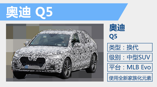 根据奥迪公布的产品规划,旗下中型SUV—Q5将在今年迎来全新换代,并有望于今年10月开幕的巴黎车展中正式发布。新一代Q5将基于全新MLB Evo平台打造,车身重量较现款大幅降低。网通社梳理了奥迪新产品后发现,在新平台上打造的全新奥迪Q5将推出多款家族车型,包括性能版S Q5、高性能版RS Q5以及插电式混合动力版本,未来全新Q5的这几款家族车型均有望引入国内。