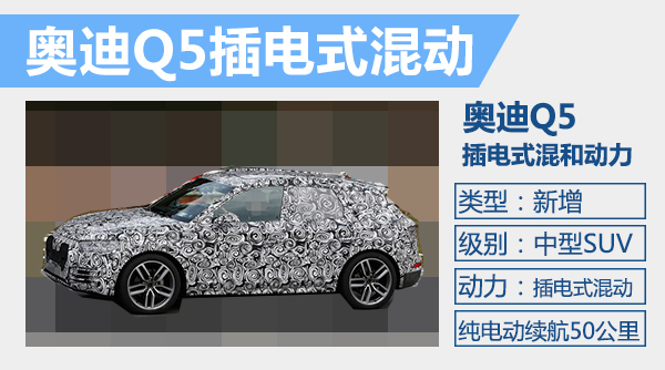 全新一代Q5还将推出一款插电式混合动力版本。预计新车所搭载的插混动力系统由2.0T涡轮增压发动机与电动机组成,在纯电动模式下的续航里程能够达到约50公里。新一代Q5有望在今年10月举办的巴黎车展中发布,随后于2017年引入国内。插电式混合动力版本最终是以进口还是国产的形式入华,还需要后续继续跟进。
