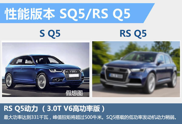 新一代Q5将在普通版的基础上衍生性能版SQ5和高性能版RS Q5车型,这两款车将在动力输出上更为强劲。全新RS Q5将搭载一台3.0升V6双涡轮增压发动机,最大输出功率为331千瓦,传动方面新车将匹配一款8速自动变速箱和Quattro四驱系统。全新SQ5在动力上将稍弱于RS Q5车型,现款SQ5所搭载的一款双涡轮增压发动机,最大输出功率为260千瓦。