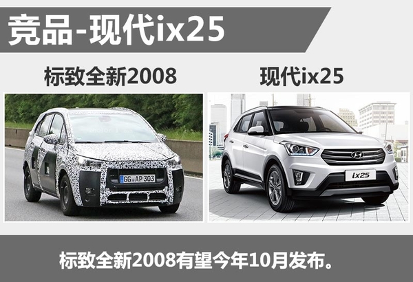 标致新一代2008将在通用的西班牙Zaragoza工厂投产,预计将在今年10月举行的巴黎车展上正式发布,并有望在今年年底前正式上市。凭借优化的平台优势和更加充足的车内空间,标致全新2008上市后将为现代ix25带来不小的压力。