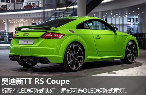 奥迪新TT RS Coupe采用了Lime Green车身配色风格,后视镜盖、前唇和后扰流器部位使用了亮黑色碳纤维材料,同时配有LED矩阵式头灯,尾部可选OLED矩阵式尾灯,而这将是奥迪旗下首款使用OLED灯组的量产版车型。新车标配强化铝合金20英寸七幅轮毂和255/30 R20尺寸的轮胎,并可选装RS运动排气系统。