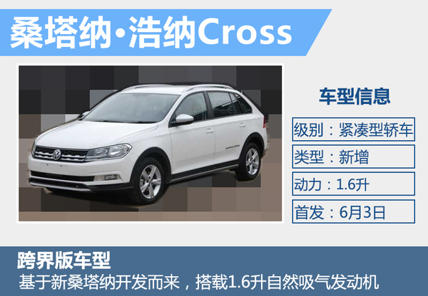 大众在华正不断推进“家族化”,桑塔纳目前已经推出了浩纳(两厢版)、尚纳(三厢版)两款车型,未来大众还将推出更多的车型来打造桑塔纳的家族体系。网通社从上海大众官方获悉,全新桑塔纳·浩纳Cross版车型将于6月3日首发。外观方面,新车装配了具有跨界风格的外观套件,而在动力上,新车将有望搭载一台1.6升自然吸气发动机。