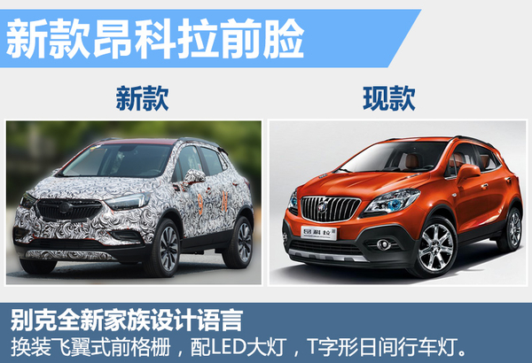新款昂科拉在外观上有着明显的变化,相比现款车型的设计更加年轻化,其中最明显的变化就是换装别克家族最新设计语言的飞翼式直瀑前格栅,与全新一代君越如出一辙。新车还配备了与海外版车型相同LED大灯,灯组内部融入别克首次使用的展翼型日间行车灯,使眼神更加犀利。雾灯区域进行了全新的设计,下保险杠进行了横向处理,带来更加流畅的视觉效果。
