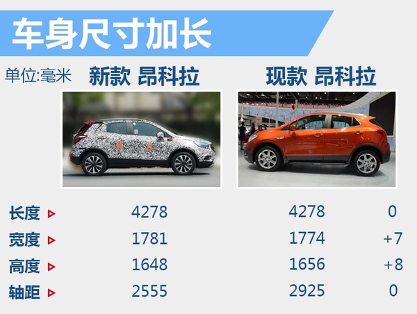新车配备全新造型的双色铝合金轮毂,尺寸依然为18寸,为整车增添了几分运动的气息。此前曝光的信息显示,新款昂科拉车身尺寸为4278*1781*1648毫米,轴距为2555毫米。与现款车型相比差别不大,仅在宽度与高度上增加了7毫米与8毫米,尺寸得到小幅增长。2555毫米的轴距可以满足消费者对于空间的需求。