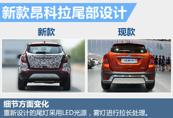新款昂科拉尾部变化与现款车型相比并不明显,主要体现在细节方面。新车尾灯造型经过了重新的设计,并采用LED光源,提高对后方车辆的灯光警示作用。后雾灯的位置上移,并采取拉长的横向处理。车尾下方的银色护板得到保留,与车头的银色护板形成呼应,同时也能减少在非铺装路面行驶时的碰擦对车身造成的伤害。