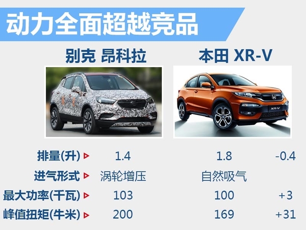 动力方面,新车预计搭载与现款相同的1.4T增压发动机,最大功率为103千瓦、峰值扭矩200牛米,传动方面有望匹配6速手动变速箱和6速DSS智能启停变速箱。与同级别小型SUV本田XR-V相比新款昂科拉有着涡轮增压的优势,最大功率比XR-V搭载的1.8升自然吸气发动机多出了3千瓦,最大扭矩高出31牛米。