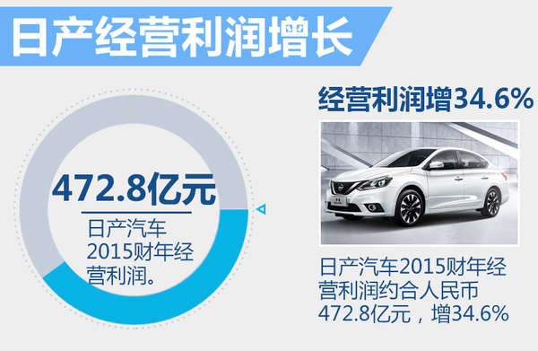 日产2015年全球累计销量542.1万辆,同比增长11%。得益于销量的增长,日产2015财年营业利润也取得了增长。网通社从日产汽车官方了解到:2015财年(即2015年4月1日至2016年3月31日)经营利润为7,933亿日元(约合472.8亿元人民币),同比增长34.6%。中国作为日产最大的市场之一,2015年贡献了125万辆的销量,同比增长6.3%,对营业利润的增长起着重要作用。
