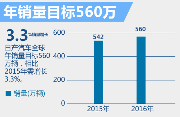 在2015财年取得增长的基础上,日产汽车对下一财年也有了新的预期。2016财年(即2016年4月1日至2017年3月31日)预期销量560万辆,增长3.3%,约占全球市场份额的6.3%。预期净收入11.80万亿日元(约合人民币0.70万亿人民币),经营利润7,100亿日元(约合人民币423.16亿元),日常收益8,000亿日元(约合人民币476.8亿元),净收益5,250亿日元(约合人民币)。