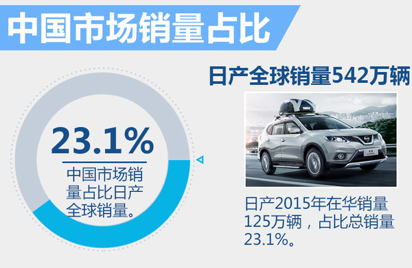 日产2015年在中国市场推出了全新楼兰、全新逍客、英菲尼迪Q70L等9款新车,随着新产品的密集投放,日产2015年累计销量125.01万辆,同比增长6.5%。根据日产公布的数据,企业2015年全球累计销量542.1万辆,中国市场占比23.1%,是日产最大的市场之一。2016年,日产会在中国市场投放西玛、QX30等多款新产品,巩固在华市场份额。
