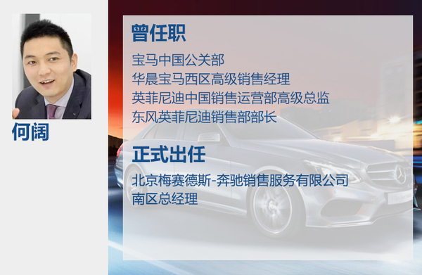 | 北京梅赛德斯-奔驰 | 何阔 | 东风英菲尼迪汽车有限公司销售部部长 | 北京梅赛德斯-奔驰销售服务有限公司南区总经理 |