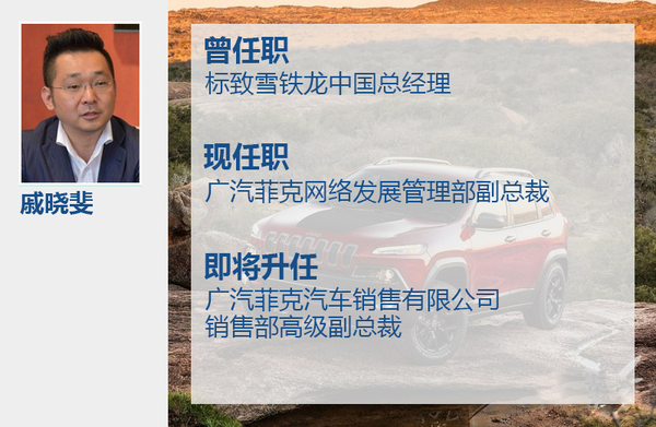 | 广汽菲克 | 戚晓斐 | 广汽菲亚特克莱斯勒汽车销售有限公司网络发展管理部副总裁 | 广汽菲亚特克莱斯勒汽车销售有限公司销售部高级副总裁 |