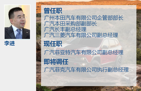 | 李进 | 广汽菲亚特克莱斯勒汽车销售有限公司副总经理 | 广汽菲亚特克莱斯勒汽车销售有限公司执行副总经理 | |