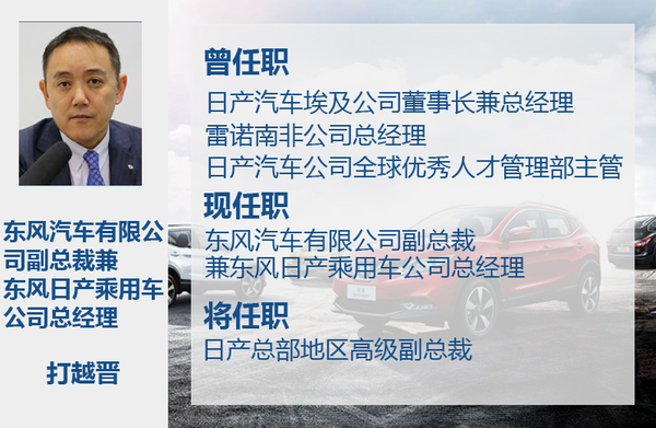 | 东风日产 | 打越晋 | 东风汽车有限公司副总裁兼东风日产乘用车公司总经理 | 日产公司总部地区高级副总裁 |