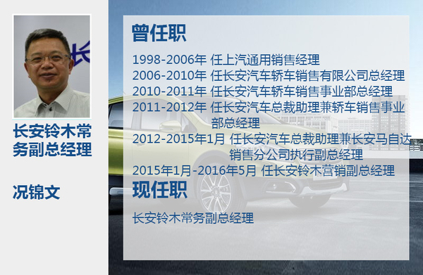 | 长安铃木 | 况锦文 | 长安铃木营销副总经理 | 长安铃木常务副总经理 |