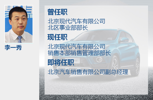 | 北京汽车 | 李一秀 | 北京现代汽车有限公司销售本部销售管理部部长 | 北京汽车销售有限公司副总经理 |