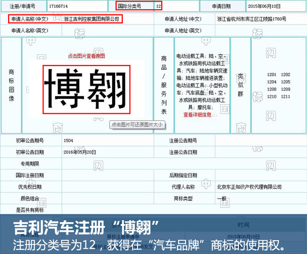 网通社从国家工商行政管理总局商标局公布的信息中了解到,吉利汽车于2015年6月10日申请注册“博翱”的商标名称,在同年9月23日已经获得了此商标在“汽车品牌”方面的商标使用权。按照目前吉利产品的命名体系,上市不久的博越内部代号为NL-3,则内部代号为NL-4的全新紧凑型SUV有望命名为“博翱”。新车将在今年第三季度正式上市,推出后将进一步加强吉利汽车在紧凑型SUV领域的布局。