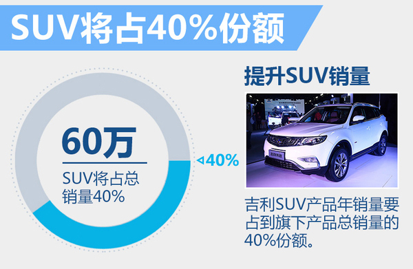 吉利汽车销售公司总经理林杰曾经表示:“近年中国SUV市场‘高烧’不退,众多品牌更不断推出SUV新品,以完善各自SUV产品线。相比之下,吉利汽车SUV在全系车型中占比并不高,接下来希望通过多款SUV车型的投放,将SUV占比提升到35%—40%,以进一步促进整体销量增长。”全新博翱上市后,连同现有车型带来的销量增长将共同为销量目标提供有力的支撑。
