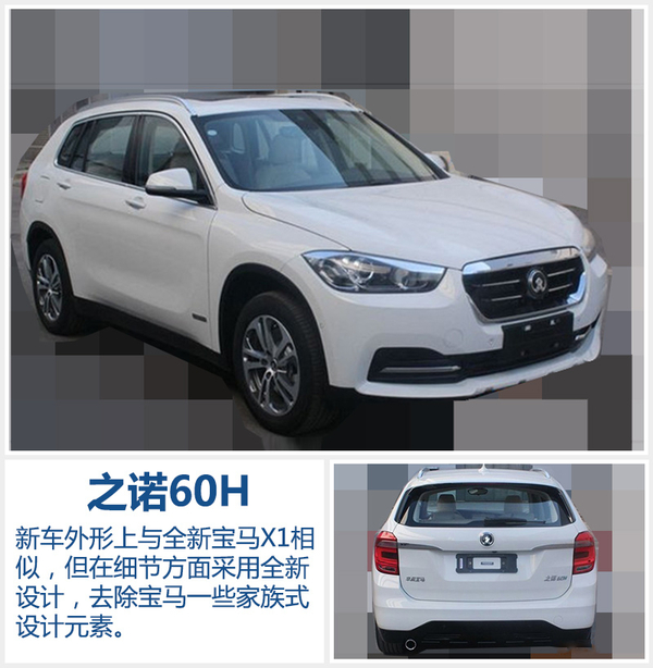定位于紧凑型SUV,之诺60H的长宽高分别为4,582*1,820*1,609毫米,轴距为2,780毫米,其尺寸与全新宝马X1长轴版基本一致。不仅如此,新车外观方面同样与全新X1类似,但细节之处有所改变。去除“宝马”的一些家族式元素,进气格删采用双横幅式,前保险杠采用左右贯通设计;尾部方面也与X1有所不同,采用纵向排列的尾灯组并配有贯穿左右的镀铬装饰条,明显的“之诺60H”标志体现出新车身份。