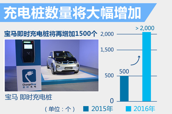 在基础设施方面,华晨宝马汽车有限公司之诺品牌管理及宝马新能源总监马霆(Martijn Oremu)此前表示:“截止到2015年,宝马已经在中国城市建设超过500个即时充电公共充电桩,2016年将建设超过1,500个公共充电桩。”届时,宝马在中国投资建设的即时充电桩将超过2,000个。中国作为宝马全球最大的单一市场,也将成为新能源产品投放的重点市场。