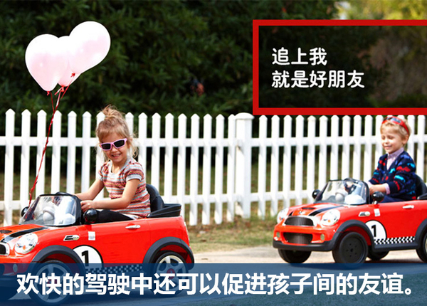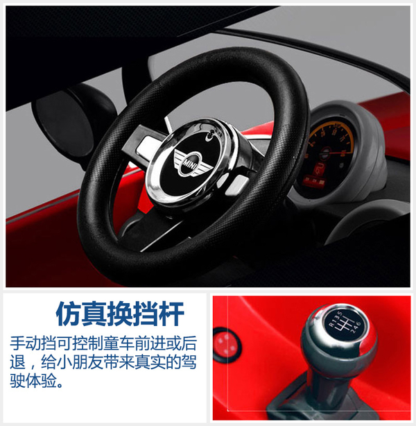 这款MINI童车由好孩子生产制造,获得宝马公司授权书。MINI动感的外观造型让人印象深刻,其儿童版汽车继承了MINI家族式外观特点,更加入童车趣味,将轻巧与趣味相结合。该车拥有仿真换挡杆,可控制车子前进或后退,给小朋友带来逼真的驾驶感受;方向盘集成收音机和MP3,可让小朋友一遍开车一遍享受音乐带来的乐趣;安全方面,整车采用POM塑钢驱动齿轮、耐磨防滑轮胎、四通道遥控器、宽大舒适座椅,为小朋友玩乐时刻保驾护航。