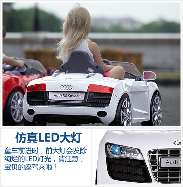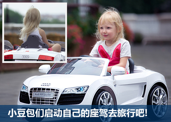 这款奥迪R8童车同样由好孩子生产制造,获得奥迪公司授权书。奥迪R8童车配备仿真中控,方向盘可控制前进后退,同时配有喇叭声和汽车加速声;车头前脸采用仿真LED前大灯,小车前进时,前大灯会照射出绚烂的灯光;轮胎采用原生工程塑料,其特点为强度高、耐磨所,并配防滑胶条,在光滑的地面上也不用担心会打滑。值得一提的是,奥迪R8实车采用后置引擎,而在好孩子童车上也同样体现出来,小车后备箱可以打开,内部配有仿真引擎装置,让小朋友的座驾更有“内涵”。