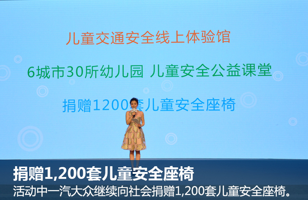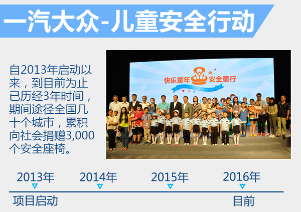 “儿童安全行动”是一汽-大众企业在华制定的重要公益项目,旨在提高公众对于儿童乘车安全的认知,让更多的家庭充分认识到使用儿童安全座椅的重要性。自2013年启动以来,到目前为止已历经3年时间,期间途径全国几十个城市,累积向社会捐赠3,000个安全座椅。