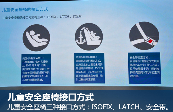 LATCH为美国标准接口规格:儿童从使用的下扣件和拴带。从2002年9月1日起,美国的法律已经规定:所有种类的新车必须具有LATCH儿童约束固定系统。欧洲标准的ISOFIX:国际标准组织固定方式。欧洲国家从上世纪末期开始设计并实施的,ISOFIX国际标准于1999年出台,逐步开始要求在车辆中设计这样的规格装置。最后一个是安全带固定方式:安全带接口固定方式其实就是汽车自身的接口方式,目前使用最多的,同时支持正向固定和反向固定两种形式。