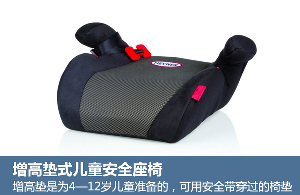 增高垫式儿童安全座椅:身高不足的儿童直接使用汽车安全带是非常危险的,容易扼住颈部造成窒息,儿童安全座椅增高垫是为4—12岁儿童准备的可用安全带穿过的加高椅垫,价格不贵而且实用,可以避免儿童因为身材过小而发生安全带勒住颈部的危险。