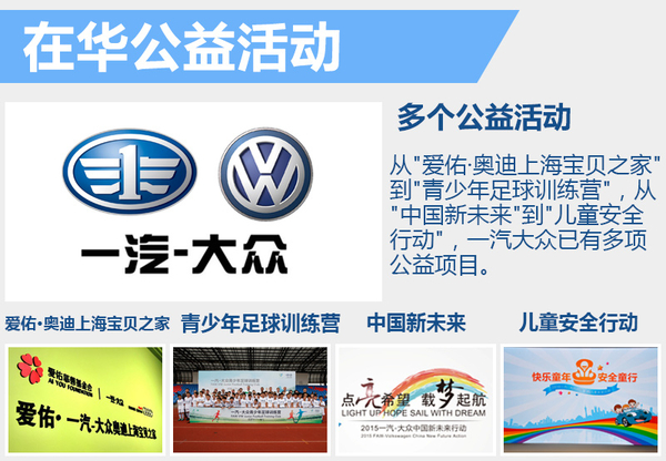 在2013年11月20日广州车展大众汽车集团媒体之夜上,大众汽车集团(中国)宣布将联合上海大众、一汽-大众两家合资企业,汇聚旗下大众汽车、奥迪、斯柯达、西雅特、保时捷、宾利6大品牌的力量,共同发起“大众汽车集团儿童安全行动”。