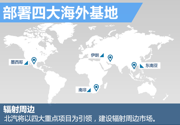 未来北汽将海外市场拓展划分了三条线,归纳为“一带一路一洲+哥伦布航线”,其中“一带一路”符合大环境下的海外发展趋势,“一洲”则是“一带一路”中涉及到的非洲,在此基础上,北汽增加了“哥伦布航线”沿途的中南美地区。继续细化,北汽将以“南非、伊朗、东南亚、墨西哥”四大重点项目为引领,建设辐射周边市场的四大海外运营基地,逐步实现从“旅行者”到“定居者”的角色转变。