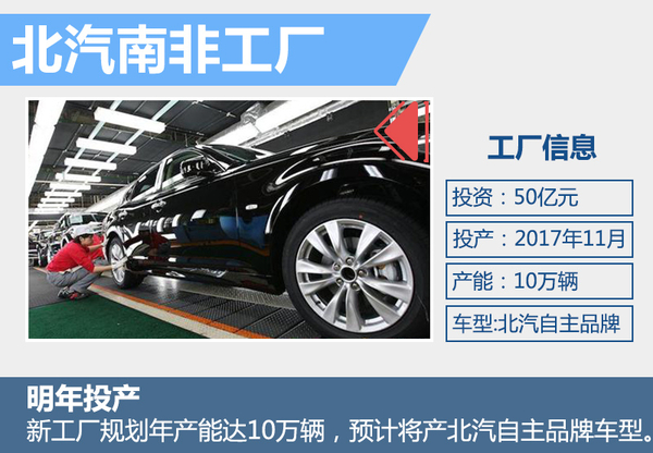 与跨国车企在中国的发展要寻求本地车企进行合作类似,北汽在南非新建的工厂将由北汽集团与南非工业开发公司的合资企业负责运营。新工厂总投资金额达到50亿元(7.73亿美元),计划于下月开始建设,有望于2017年11月建成投产,计划年产能为10万辆。