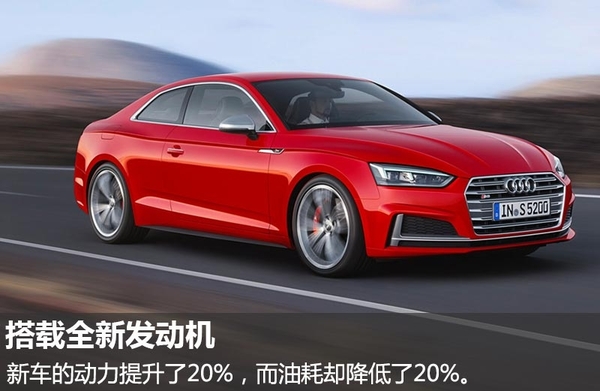 A5 Coupe有望分享A4 Coupe的动力配置,其中包括排量为2.0升的直列四缸涡轮增压发动机,最大输出功率为188千瓦,匹配6速手动或7速双离合变速箱。S5 Coupe则将搭载全新3.0升涡轮增压V6发动机,最大输出功率为264千瓦,百公里加速用时仅需4.7秒,标配Quattro四轮驱动系统。新车的动力提升了20%,而油耗却降低了20%。