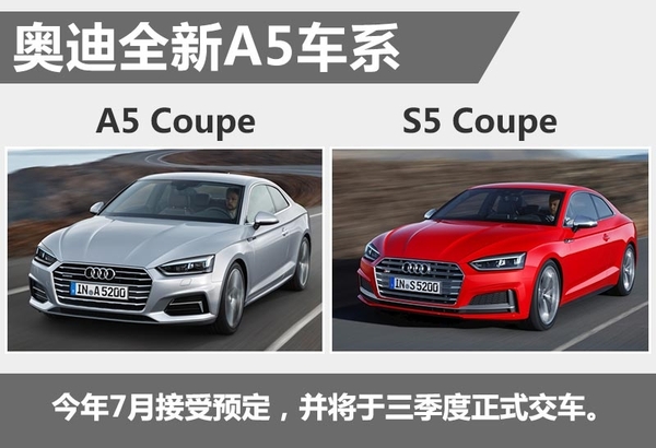 新车将在今年7月接受预定,并将于三季度正式交车。奥迪董事会主席Ruper Stadler说道:“全新A5 Coupe和S5 Coupe的性能表现和燃油经济性均有所提升,车内空间更大,标准配置升级,驾驶新A5 Coupe和S5 Coupe的每一天都能为消费者带来全新的愉悦体验。”