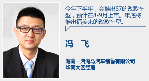 2015年海马郑州销量再次突破10万台接近11万台,根据海马汽车整体规划,今年海马整体目标将提升至25万辆。海南一汽海马汽车销售公司华南大区经理冯飞在接受媒体采访时表示:“在今年下半年,我们会推出S7的改款车型,预计会在8-9月上市,但这款车型是小改款,并不是一个全新的车型。年底将推出福美来的改款车型。”
