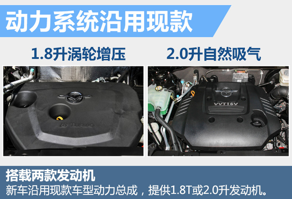 新车将沿用现款车型的动力系统,其中1.8升涡轮增压发动机,最大功率138千瓦,最大扭矩230牛米,与之匹配的是一台6速自动变速箱;2.0升自然吸气发动机,最大功率110千瓦,最大扭矩220牛米,与之匹配的是5速手动与5速自动变速箱。