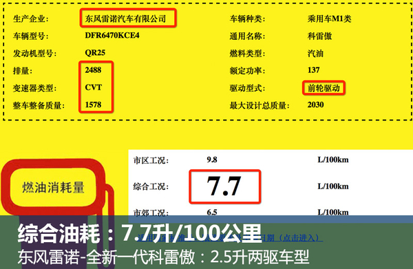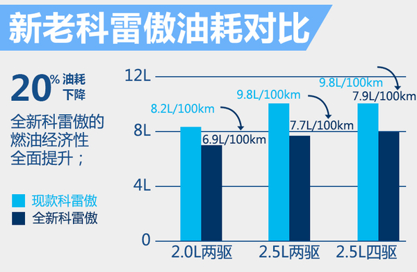 在燃油经济性方面,全新一代科雷傲2.0升、2.5升两驱车型综合油耗分别为6.9升和7.7升,与现款科雷傲8.2升和9.8升的综合油耗相比,油耗最高降低20%。全新一代科雷傲搭载2.5升自然吸气发动机的适时四驱车型综合油耗为7.9升,同样优于现款同排量车型。