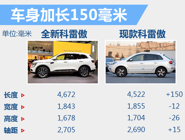 动力进行全面升级的同时,全新一代科雷傲车型定位也有所提升,官方定义为一款中型SUV。新车基于雷诺日产全新CMF平台打造,整车尺寸较现款进口版进一步加长,车身长度增加150毫米至4672毫米,轴距增加15毫米至2705毫米,与目前市场上主流中型SUV的整车尺寸相近。