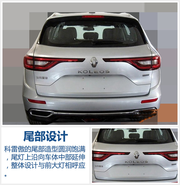 车尾与前脸相呼应,采用全LED光源尾灯组,“KOLEOS”“的尾部标识置于雷诺LOGO下方,整体设计简洁大气。左侧尾灯组下方的“东风雷诺”标识,昭示了新车在华本土化投产的身份。新车保险杠的嵌入处理的十分微妙,并没有生硬的感觉,双出镀铬隐藏式尾排符合时下潮流设计。