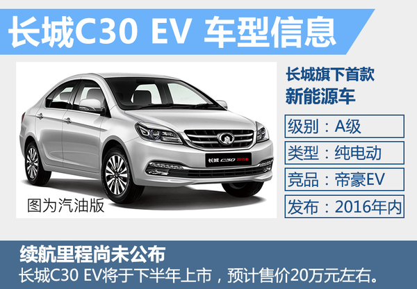 据悉,长城汽车将在下半年发布旗下首款纯电动车型——长城C30EV,新车基于长城C30打造而来,并推出面向出租车市场和个人市场的两个版本车型。而电池、电机和变速箱等核心零部件,则与韩国LG、德国西门子、德国舍弗勒等供应商合作。