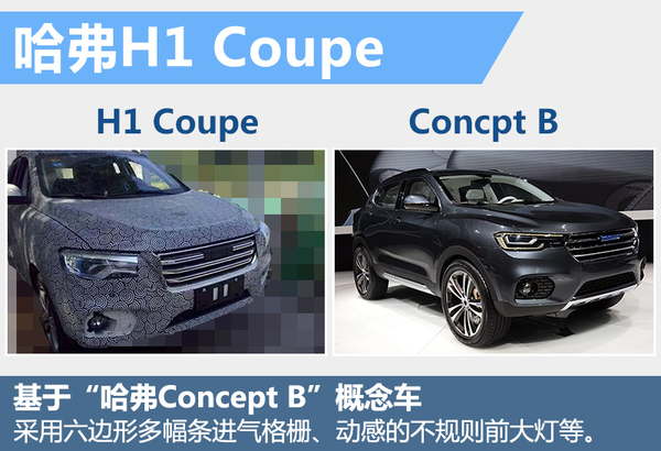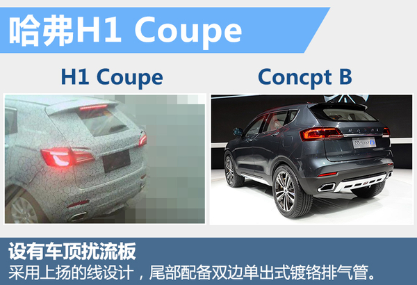 此外,基于“哈弗Concept B”概念车的量产版车型——哈弗H1 Coupe也将于年内发布,H1 Coupe外观借鉴了Concept B概念车的大量设计元素,包括六边形多幅条进气格栅、动感的不规则前大灯等。尾部方面,哈弗H1 Coupe采用了上扬的腰线设计,且设有车顶扰流板以及双边单出式镀铬排气管,很是动感。