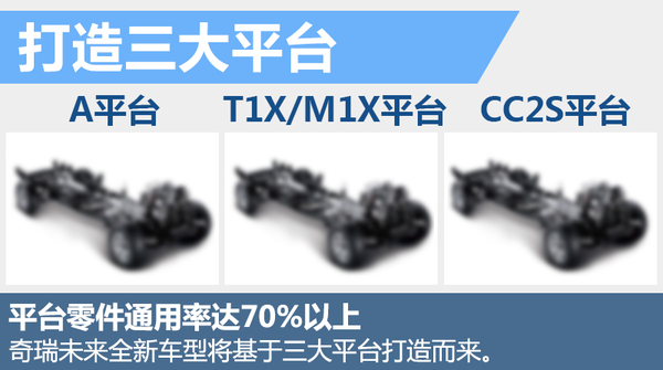 按照规划,未来五年奇瑞将形成全新三大产品平台作为全新车型开发的支撑。包括A平台(注重产品的性价比,注重燃油经济性)、T1X/M1X平台(更均衡的性能,更好的延展性)、CC2S平台(更出色的底盘和操控性能),各平台零件通用率将达到70%以上,奇瑞未来推出的全新车型均将基于这三大平台打造。从已知的研发代号来看,瑞虎TX(T15)和瑞虎3X(T17)将基于均衡性能的T1X平台开发而来。